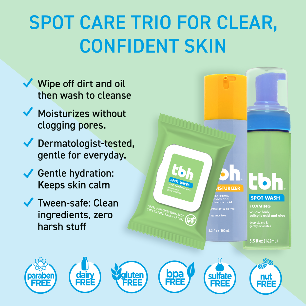 Manage blemish-prone skin without harshness using our 3-step kit that deep cleans and evens skin tone gently. Includes Spot Foaming Face Wash, Skin Cleansing Wipes, and Lightweight Face Moisturizer, all utilizing natural ingredients like willow bark and jojoba. Free from harsh chemicals and dermatologist-recommended for safe, effective tween skin care.